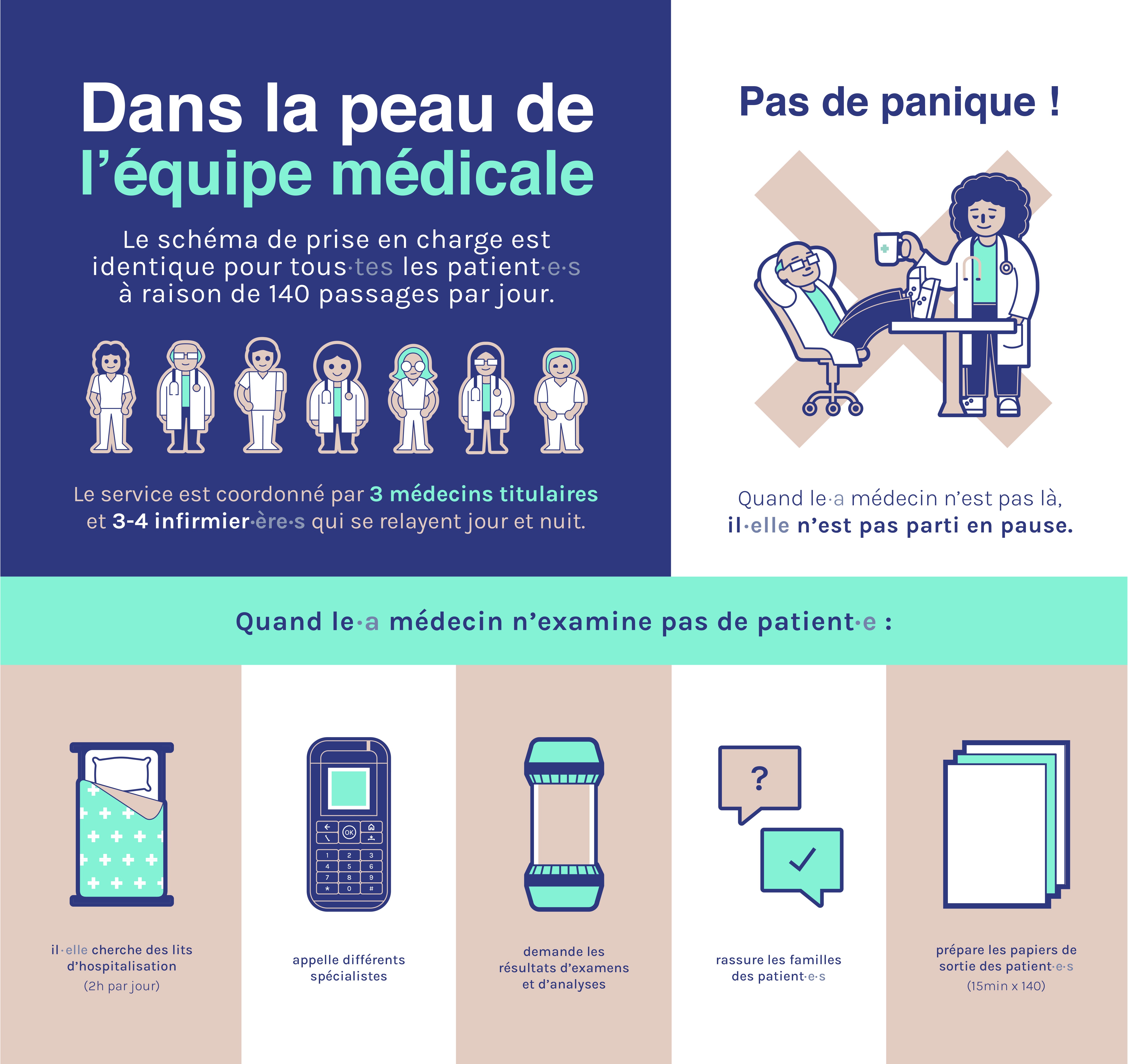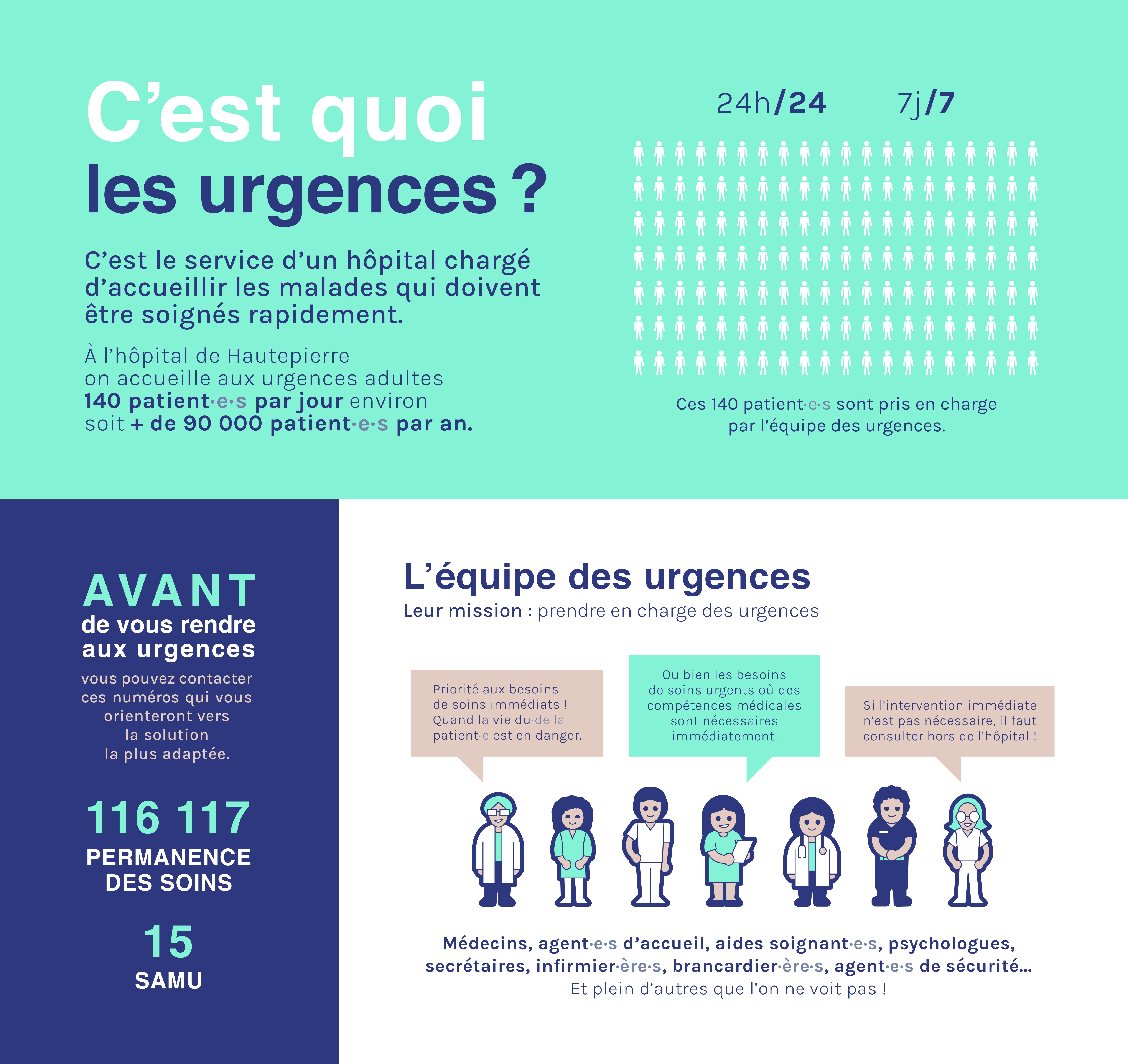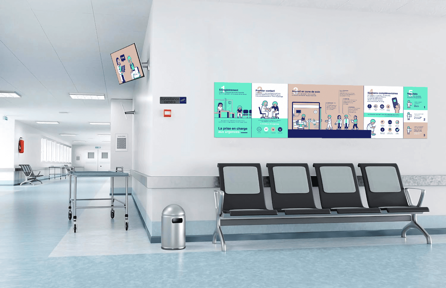 Creation of a series of posters and videos for patients in the emergency department at Hautepierre Hospital (Strasbourg). The posters explain the treatment process, the role of the emergency department, and provide an overview of the medical team's daily routine. Videos explain the four main reasons for waiting times in emergency departments.